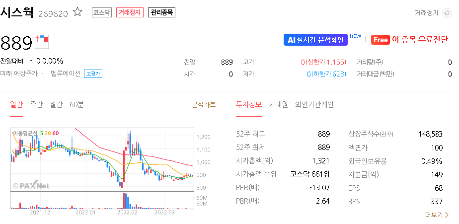 외국인 보유 비중은 0.49% 이며 장중 거래량은 0원 을 기록했습니다. 매출액은 92억 원을 달성했습니다. EPS는 없음원이며 시스웍 주식 배당수익률은 -5% 입니다.