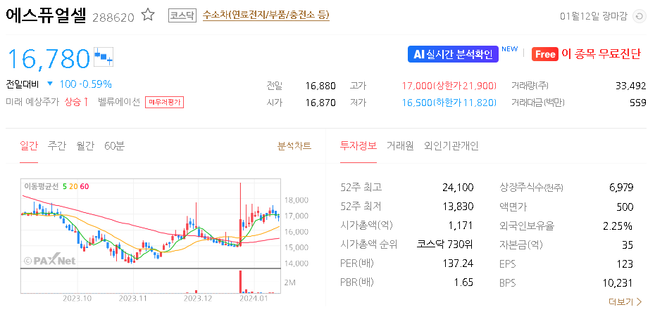 에스퓨얼셀 현재 주가는 16,780원이며 전일 대비 -100원의 모습을 보이고 있습니다. 에스퓨얼셀의 주주현황을 살펴보면 에스에너지 주주가 전체 지분 38.77%를 소유하고 있습니다. 에스퓨얼셀는 전자 장비 및 기기 기업으로 장중 기준으로 주가는 16,780원 입니다. 에스퓨얼셀의 시가 총액은 1171억 원이며 발행 주식수는 6,979,316주 입니다.