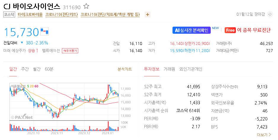 CJ 바이오사이언스의 시가 총액은 1433억 원이며 발행 주식수는 9,112,502주 입니다. 외국인 보유 비중은 2.66% 이며 장중 거래량은 46,253원 을 기록했습니다. 매출액은 41억 원을 달성했습니다. EPS는 없음원이며 CJ 바이오사이언스 주식 배당수익률은 % 입니다.