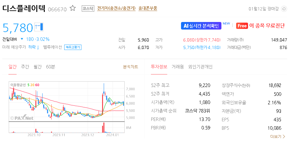 디스플레이텍 현재 주가는 5,780원이며 전일 대비 -180원의 모습을 보이고 있습니다. 디스플레이텍의 주주현황을 살펴보면 박윤민 주주가 전체 지분 33.83%를 소유하고 있습니다. 디스플레이텍는 휴대폰 및 관련부품 기업으로 장중 기준으로 주가는 5,780원 입니다. 디스플레이텍의 시가 총액은 1080억 원이며 발행 주식수는 18,691,918주 입니다.
