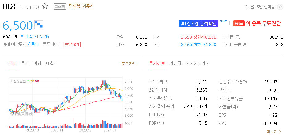 외국인 보유 비중은 16.10% 이며 장중 거래량은 80,365원 을 기록했습니다. 매출액은 43,191억 원을 달성했습니다. EPS는 없음원이며 HDC 주식 배당수익률은 3,943% 입니다.
