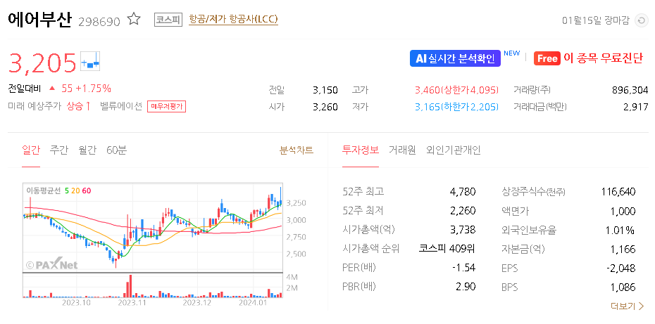 외국인 보유 비중은 1.01% 이며 장중 거래량은 613,077원 을 기록했습니다. 매출액은 6,418억 원을 달성했습니다. EPS는 없음원이며 에어부산 주식 배당수익률은 -813% 입니다.