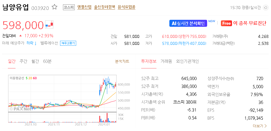 외국인 보유 비중은 7.93% 이며 장중 거래량은 2,092원 을 기록했습니다. 매출액은 7,554억 원을 달성했습니다. EPS는 없음원이며 남양유업 주식 배당수익률은 20,469,454% 입니다.