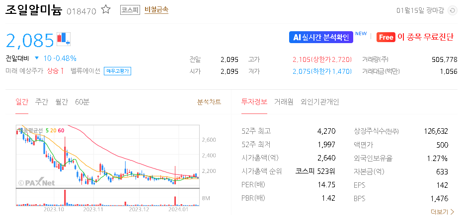 이 글에서는 조일알미늄 주가 전망과 목표 주가, 기업 정보에 대해서 설명합니다. 주식 시장에서 중요한 것은 미래의 기업 가치를 예측하고 선제적으로 움직이는 것입니다. 투자할 종목을 고르기 전에 현재 기업의 현황과 데이터를 확인하는 것이 필요합니다. 조일알미늄 주식의 주요 현황과 투자 정보를 확인하시고 주식 투자에 유용한 자료들을 정리하여 제공하오니 효율적인 투자를 해보세요.