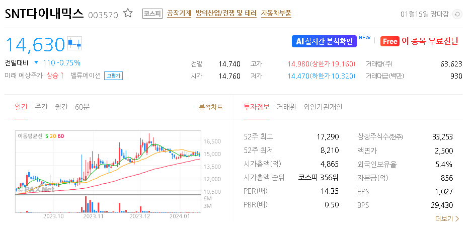 SNT다이내믹스 현재 주가는 14,740원이며 전일 대비 -7.30원의 모습을 보이고 있습니다. SNT다이내믹스의 주주현황을 살펴보면 S&T홀딩스 주주가 전체 지분 42.27%를 소유하고 있습니다. SNT다이내믹스는 자동차부품 기업으로 장중 기준으로 주가는 14,740원 입니다.