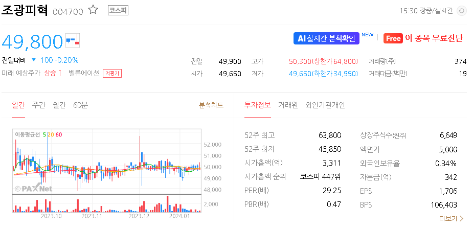 외국인 보유 비중은 0.34% 이며 장중 거래량은 254원 을 기록했습니다. 매출액은 1,011억 원을 달성했습니다. EPS는 없음원이며 조광피혁 주식 배당수익률은 5.40% 입니다.