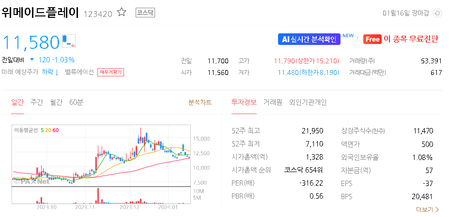 외국인 보유 비중은 1.00% 이며 장중 거래량은 122,988원 을 기록했습니다. 매출액은 904억 원을 달성했습니다. EPS는 없음원이며 위메이드플레이 주식 배당수익률은 1.42% 입니다.