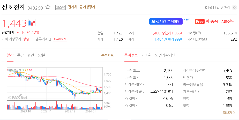 외국인 보유 비중은 3.30% 이며 장중 거래량은 190,251원 을 기록했습니다. 매출액은 1,476억 원을 달성했습니다. EPS는 없음원이며 성호전자 주식 배당수익률은 % 입니다.