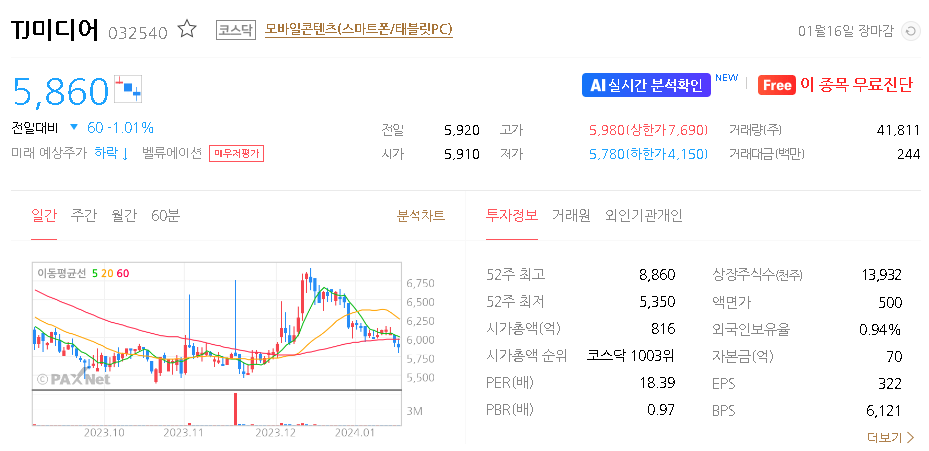 이 글에서는 TJ미디어 주가 전망과 목표 주가, 기업 정보에 대해서 설명합니다. 주식 거래에서 중요한 부분은 현재 기업 가치보다는 미래의 기업 가치를 예측하고 먼저 행동하는 것입니다. 투자할 종목을 고르기 전에 현재 기업의 상황과 지표를 살펴보는 것이 중요합니다. TJ미디어 주식의 주요 현황과 투자 정보를 확인하시고 주식 투자에 도움을 줄 자료들을 모아 두었으니 투자 결정에 도움을 받으시길 바랍니다.