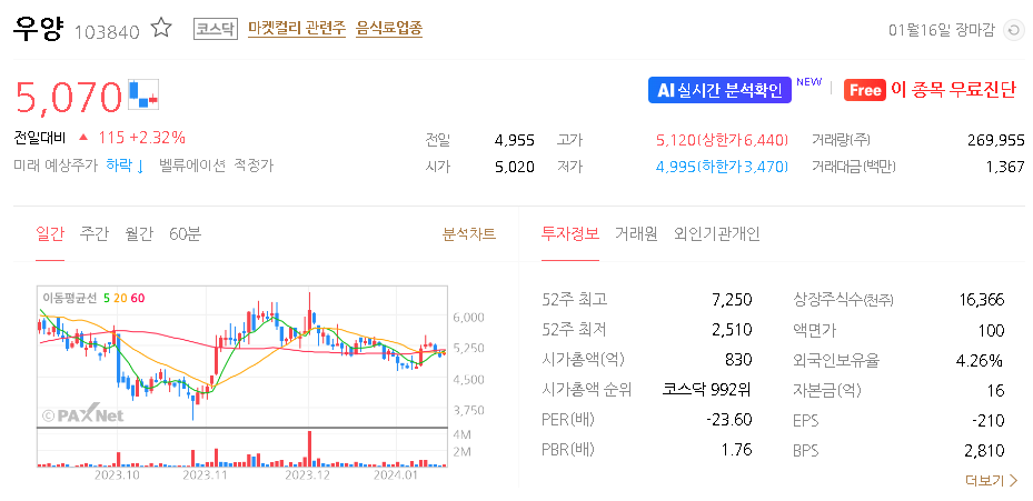 이 글에서는 우양 주가 전망과 목표 주가, 기업 정보에 대해서 설명합니다. 주식 시장에서 중요한 것은 미래의 기업 가치를 예측하고 선제적으로 움직이는 것입니다. 투자할 종목을 고르기 전에 현재 기업의 현황과 데이터를 확인하는 것이 필요합니다. 우양 주식의 주요 현황과 투자 정보를 확인하시고 주식 투자에 도움을 줄 자료들을 모아 두었으니 투자 결정에 도움을 받으시길 바랍니다.