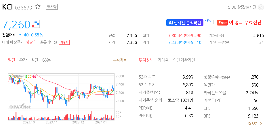 KCI 현재 주가는 7,260원이며 전일 대비 -1.09원의 모습을 보이고 있습니다. KCI의 주주현황을 살펴보면 삼양사 주주가 전체 지분 50.02%를 소유하고 있습니다. KCI는 화학 기업으로 장중 기준으로 주가는 7,260원 입니다. KCI의 시가 총액은 823억 원이며 발행 주식수는 11,270,000주 입니다.