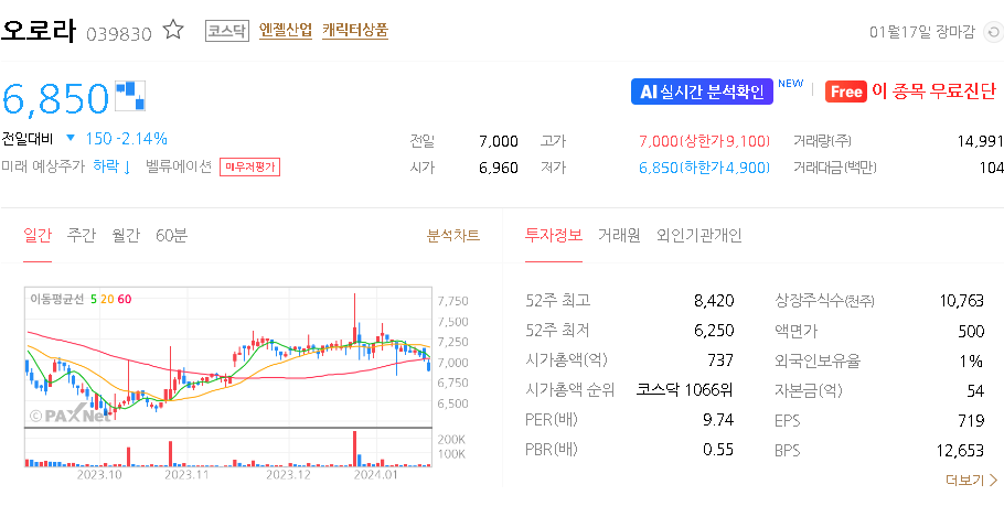 외국인 보유 비중은 1.00% 이며 장중 거래량은 14,844원 을 기록했습니다. 매출액은 1,760억 원을 달성했습니다. EPS는 없음원이며 오로라 주식 배당수익률은 % 입니다.