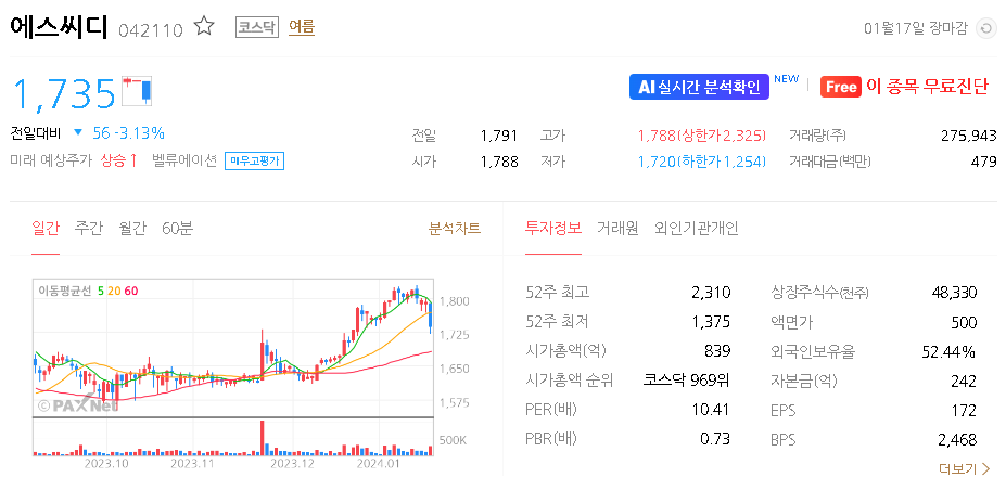 외국인 보유 비중은 52.49% 이며 장중 거래량은 135,127원 을 기록했습니다. 매출액은 1,482억 원을 달성했습니다. EPS는 없음원이며 에스씨디 주식 배당수익률은 91% 입니다.