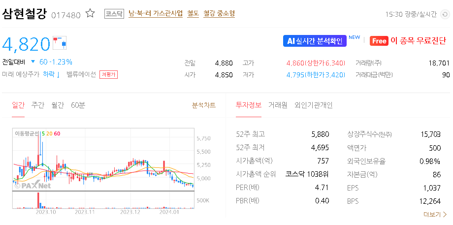 외국인 보유 비중은 1.00% 이며 장중 거래량은 12,569원 을 기록했습니다. 매출액은 1,992억 원을 달성했습니다. EPS는 없음원이며 삼현철강 주식 배당수익률은 % 입니다.