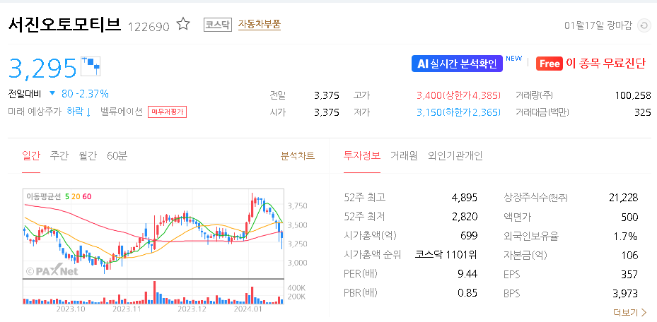 외국인 보유 비중은 1.42% 이며 장중 거래량은 47,995원 을 기록했습니다. 매출액은 17,186억 원을 달성했습니다. EPS는 없음원이며 서진오토모티브 주식 배당수익률은 5,854% 입니다.