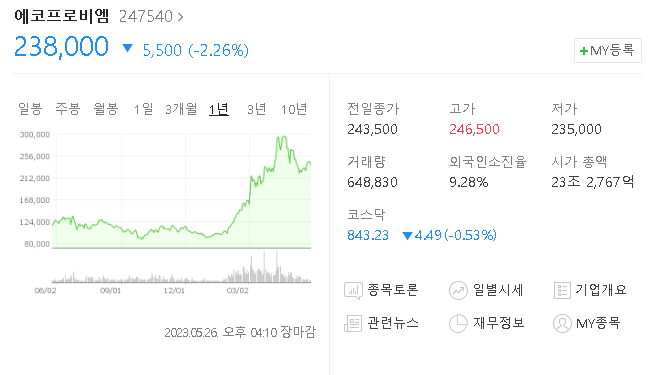 | 에코프로 주가 전망 예상, 목표 주가 확인( 2차전지 관련주, 인버스 숏포지션 ) (0) | 2023.05.27 |