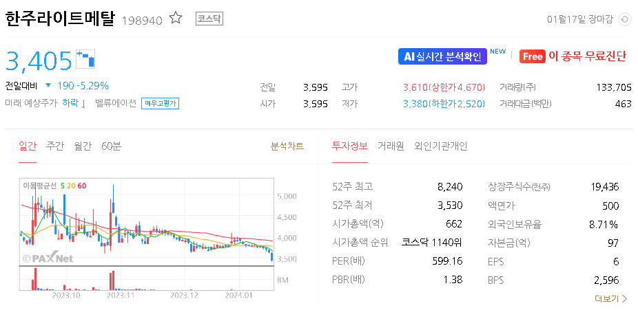 한주라이트메탈 주가 분석