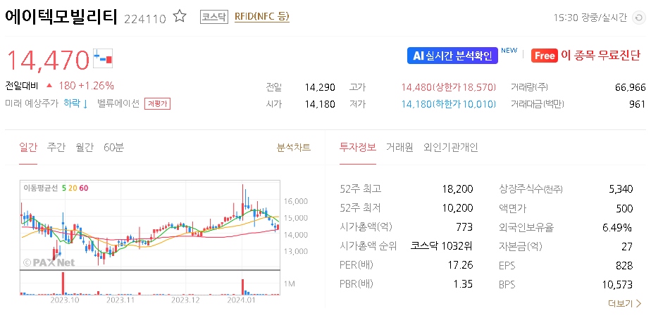 외국인 보유 비중은 6.37% 이며 장중 거래량은 22,363원 을 기록했습니다. 매출액은 1,291억 원을 달성했습니다. EPS는 없음원이며 에이텍모빌리티 주식 배당수익률은 44% 입니다.
