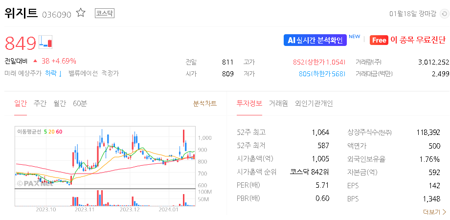 외국인 보유 비중은 2.03% 이며 장중 거래량은 5,918,632원 을 기록했습니다. 매출액은 254억 원을 달성했습니다. EPS는 없음원이며 위지트 주식 배당수익률은 % 입니다.