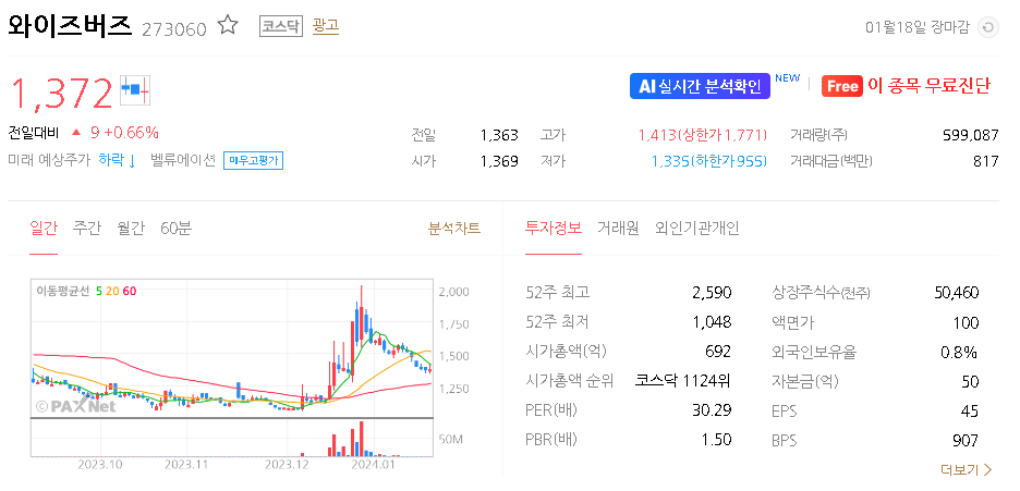 이 글에서는 와이즈버즈 주가 전망과 목표 주가, 기업 정보에 대해서 설명합니다. 주식 거래에서 주목해야 할 점은 미래의 기업 가치를 예측하고 먼저 움직이는 것입니다. 투자 대상을 선택하기 전에 현재 기업 상황과 지표를 살펴보아야 합니다. 와이즈버즈 주식의 주요 현황과 투자 정보를 확인하시고 주식 투자에 도움이 될 만한 정보들을 모아 놓았으니 투자를 고려하실 때 참고하세요.