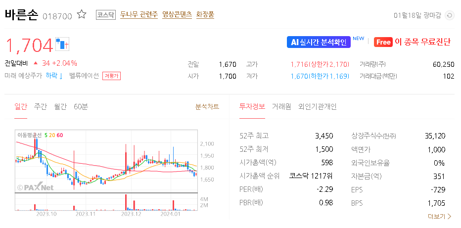 바른손 주가 분석