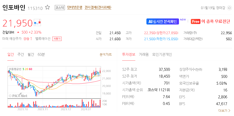 이 글에서는 인포바인 주가 전망과 목표 주가, 기업 정보에 대해서 설명합니다. 주식 투자의 핵심은 현재의 기업 가치보다는 미래의 가치를 예측하며 먼저 대응하는 것입니다. 투자 대상을 결정하기 위해 먼저 현재 기업 상태와 수치를 검토해야 합니다. 인포바인 주식의 주요 현황과 투자 정보를 확인하시고 주식 투자에 유용한 정보들을 한 곳에 정리해두었으니 투자 전에 확인하시기 바랍니다.