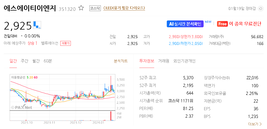 에스에이티이엔지 현재 주가는 2,925원이며 전일 대비 -80원의 모습을 보이고 있습니다. 에스에이티이엔지의 주주현황을 살펴보면 소진석 주주가 전체 지분 38.17%를 소유하고 있습니다. 에스에이티이엔지는 디스플레이 및 관련부품 기업으로 장중 기준으로 주가는 2,925원 입니다.