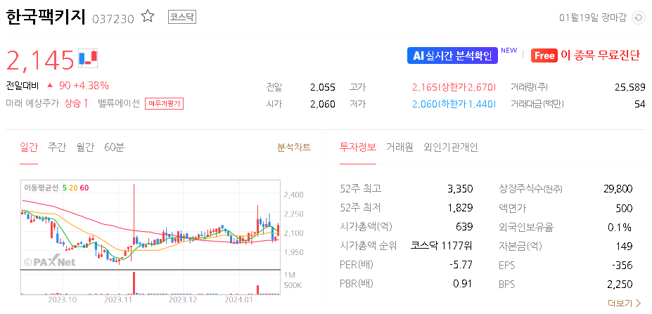 한국팩키지 주가 분석