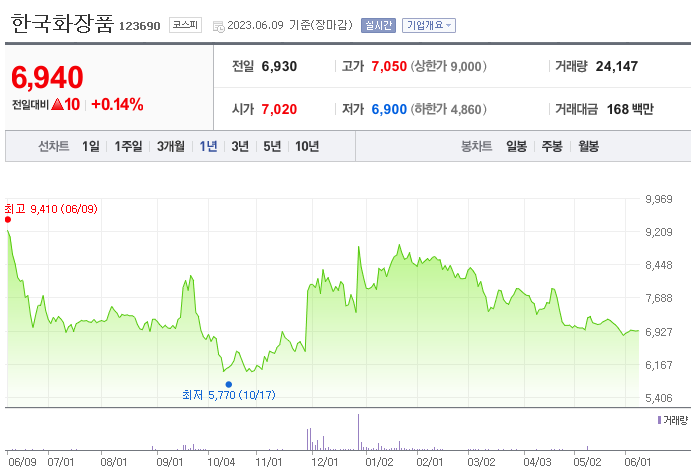한국화장품 현재 주가는 6,940원이며 전일 대비 -10원의 모습을 보이고 있습니다. 한국화장품의 주주현황을 살펴보면 한국화장품제조(외 11인)가 지분 52.94%를 소유하고 있습니다. 한국화장 품는 개인생활용품 기업으로 장중 기준으로 주가는 6,940원입니다. 한국화장품의 시가 총액은 1114억 원이며 발행 주식수는 0.68주입니다.