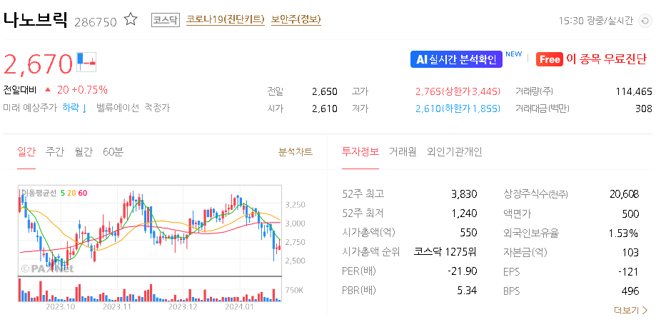 외국인 보유 비중은 1.53% 이며 장중 거래량은 162,574원 을 기록했습니다. 매출액은 24억 원을 달성했습니다. EPS는 없음원이며 나노브릭 주식 배당수익률은 % 입니다.