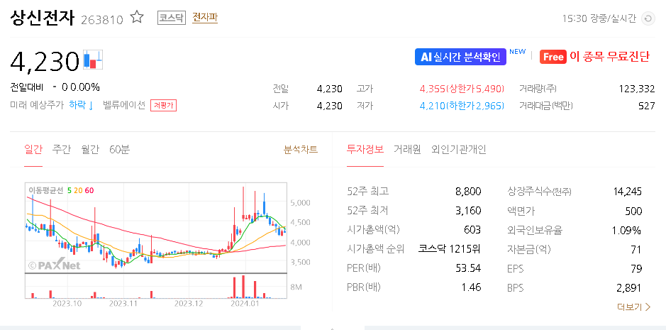 외국인 보유 비중은 1.09% 이며 장중 거래량은 162,337원 을 기록했습니다. 매출액은 846억 원을 달성했습니다. EPS는 없음원이며 상신전자 주식 배당수익률은 4% 입니다.
