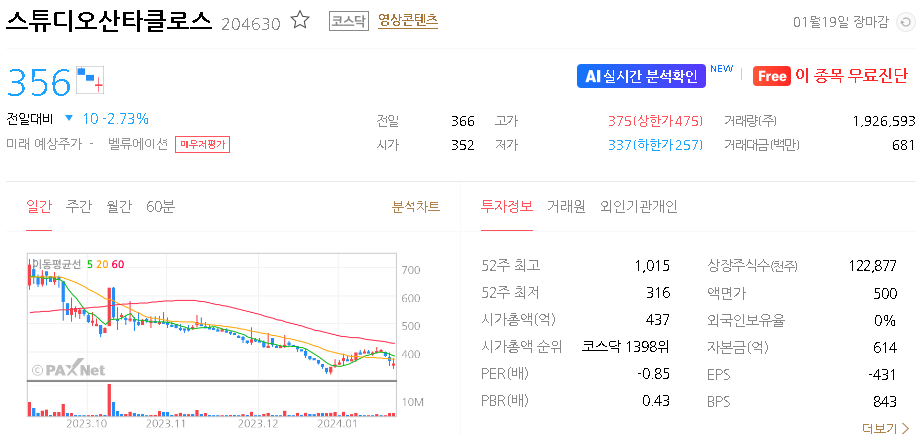 스튜디오산타클로스의 시가 총액은 437억 원이며 발행 주식수는 122,877,186주 입니다. 외국인 보유 비중은 0.00% 이며 장중 거래량은 1,724,328원 을 기록했습니다. 매출액은 43억 원을 달성했습니다. EPS는 없음원이며 스튜디오산타클로스 주식 배당수익률은 % 입니다.