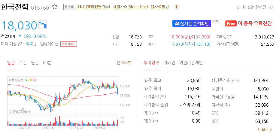 한국전력 현재 주가는 18,720원이며 전일 대비 -260원의 모습을 보이고 있습니다. 한국전력의 주주현황을 살펴보면 한국산업은행 주주가 전체 지분 51.14%를 소유하고 있습니다. 한국전력는 전력 기업으로 장중 기준으로 주가는 18,720원 입니다. 한국전력의 시가 총액은 11조5746억 원이며 발행 주식수는 641,964,077주 입니다.