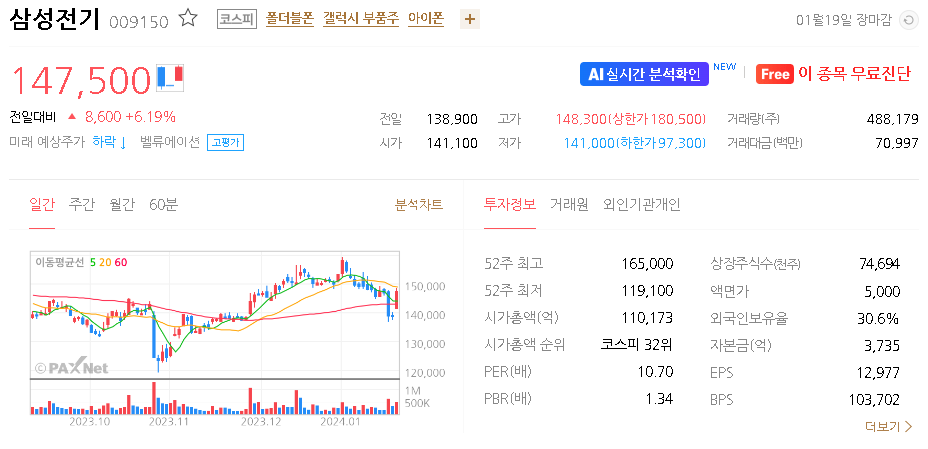 외국인 보유 비중은 30.60% 이며 장중 거래량은 328,183원 을 기록했습니다. 매출액은 66,032억 원을 달성했습니다. EPS는 6,077원이며 삼성전기 주식 배당수익률은 1.61% 입니다.