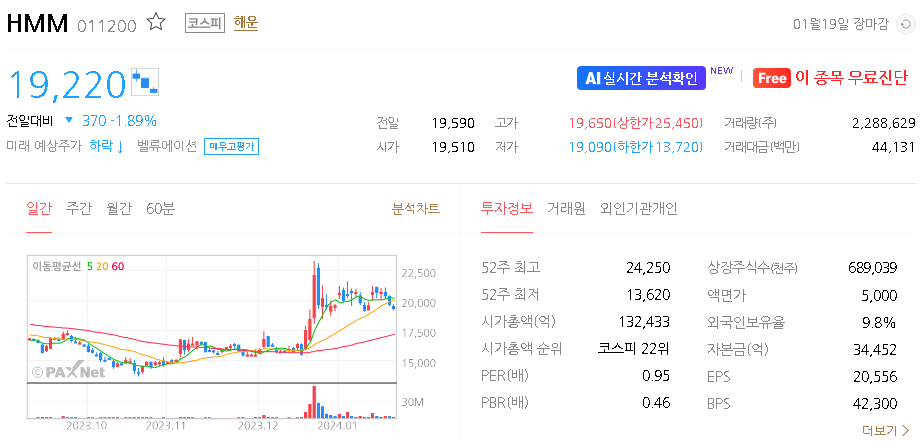 HMM 현재 주가는 19,590원이며 전일 대비 -710원의 모습을 보이고 있습니다. HMM의 주주현황을 살펴보면 한국산업은행 주주가 전체 지분 57.88%를 소유하고 있습니다. HMM는 해상운수 기업으로 장중 기준으로 주가는 19,590원 입니다. HMM의 시가 총액은 13조2433억 원이며 발행 주식수는 689,039,496주 입니다.
