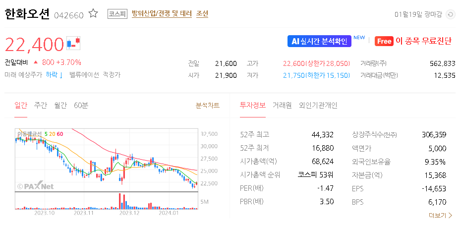 이 글에서는 한화오션 주가 전망과 목표 주가, 기업 정보에 대해서 설명합니다. 주식 시장에서 중요한 것은 미래의 기업 가치를 예측하고 선제적으로 움직이는 것입니다. 투자할 종목을 고르기 전에 현재 기업의 현황과 데이터를 확인하는 것이 필요합니다. 한화오션 주식의 주요 현황과 투자 정보를 확인하시고 주식 투자에 도움이 될 수 있는 정보들을 모아 제공하오니 참고하시면 도움이 될 것입니다.