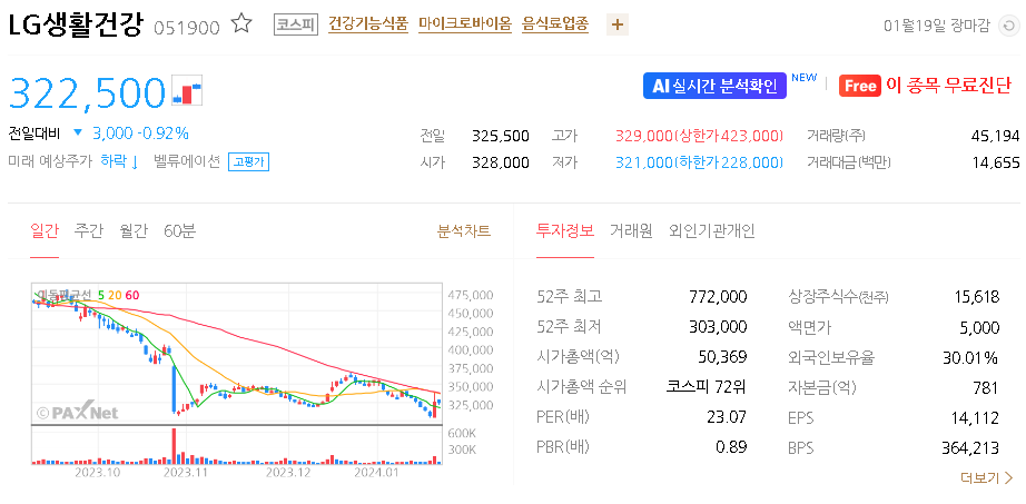 외국인 보유 비중은 30.01% 이며 장중 거래량은 143,490원 을 기록했습니다. 매출액은 52,376억 원을 달성했습니다. EPS는 17,708원이며 LG생활건강 주식 배당수익률은 0.55% 입니다.