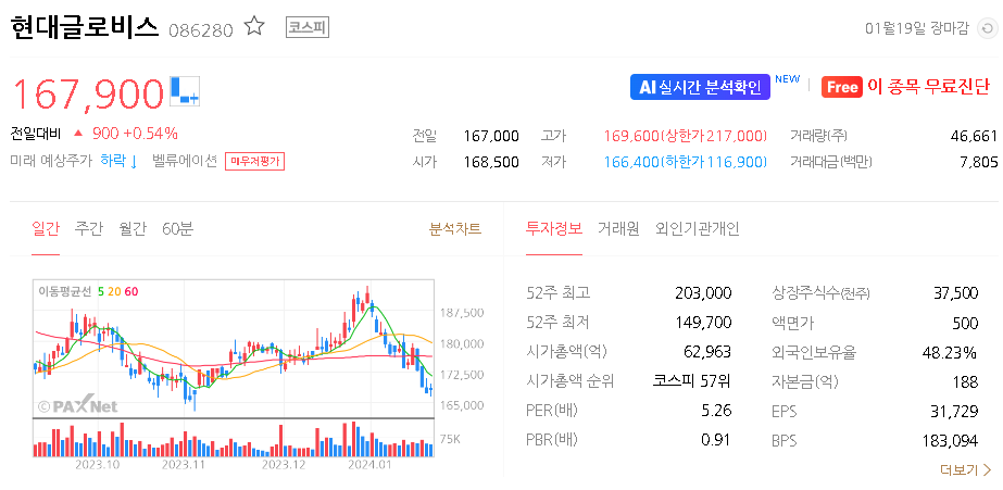 외국인 보유 비중은 48.23% 이며 장중 거래량은 50,196원 을 기록했습니다. 매출액은 191,658억 원을 달성했습니다. EPS는 30,011원이며 현대글로비스 주식 배당수익률은 3.49% 입니다.