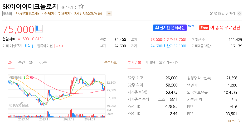SK아이이테크놀로지의 시가 총액은 5조3473억 원이며 발행 주식수는 71,297,592주 입니다. 외국인 보유 비중은 10.45% 이며 장중 거래량은 199,349원 을 기록했습니다. 매출액은 4,771억 원을 달성했습니다. EPS는 353원이며 SK아이이테크놀로지 주식 배당수익률은 2.22% 입니다.