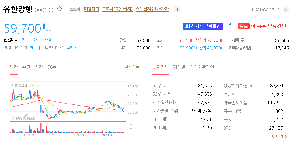 유한양행 현재 주가는 59,800원이며 전일 대비 -600원의 모습을 보이고 있습니다. 유한양행의 주주현황을 살펴보면 유한재단 주주가 전체 지분 23.34%를 소유하고 있습니다. 유한양행는 제약 기업으로 장중 기준으로 주가는 59,800원 입니다. 유한양행의 시가 총액은 4조7885억 원이며 발행 주식수는 80,209,064주 입니다.