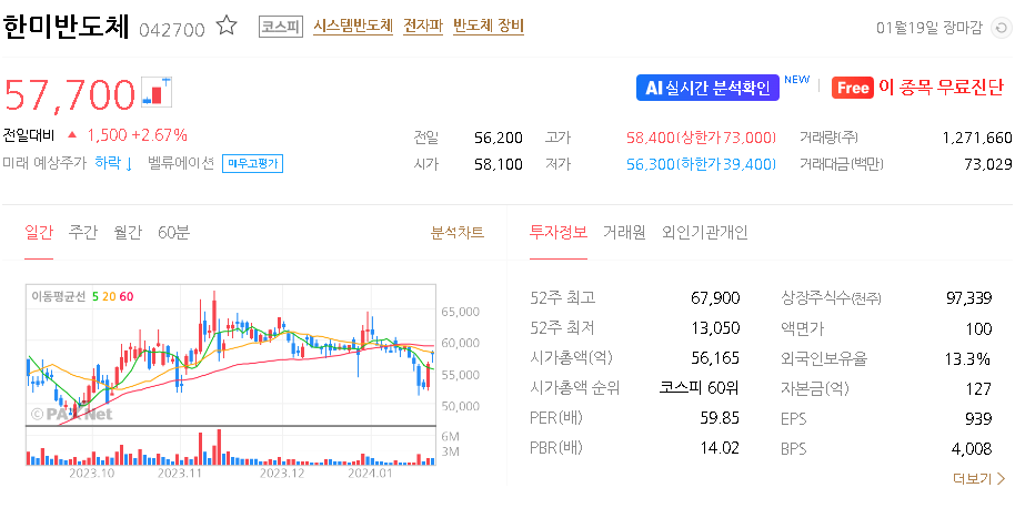 한미반도체 현재 주가는 56,200원이며 전일 대비 -3.60원의 모습을 보이고 있습니다. 한미반도체의 주주현황을 살펴보면 곽동신 주주가 전체 지분 55.01%를 소유하고 있습니다. 한미반도체는 반도체 및 관련장비 기업으로 장중 기준으로 주가는 56,200원 입니다. 한미반도체의 시가 총액은 5조6165억 원이며 발행 주식수는 97,339,302주 입니다.