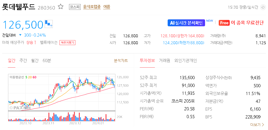 외국인 보유 비중은 11.50% 이며 장중 거래량은 8,942원 을 기록했습니다. 매출액은 30,867억 원을 달성했습니다. EPS는 10,451원이며 롯데웰푸드 주식 배당수익률은 1.88% 입니다.