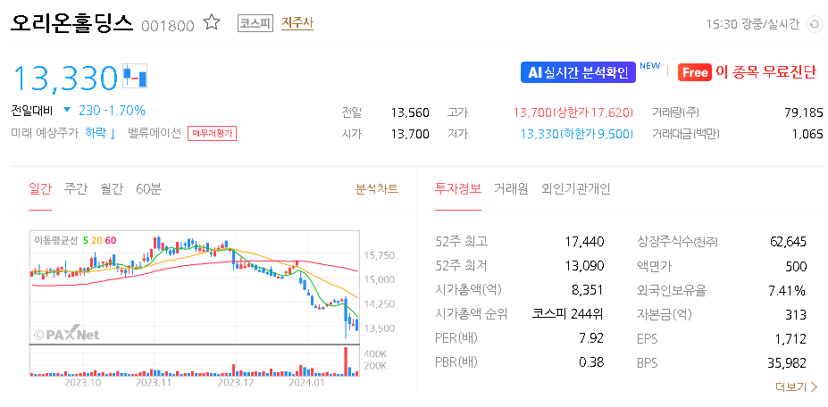 이 글에서는 오리온홀딩스 주가 전망과 목표 주가, 기업 정보에 대해서 설명합니다. 주식 시장에서 핵심은 미래의 기업 가치를 예측하고 선제적으로 움직이는 것입니다. 투자할 종목을 선택하기 전에 현재 기업의 현황과 데이터를 확인하는 것이 필요합니다. 오리온홀딩스 주식의 주요 현황과 투자 정보를 확인하시고 주식 투자에 도움이 되는 정보들을 한 곳에 모아 두었으니 참고하시면 좋을 것입니다.