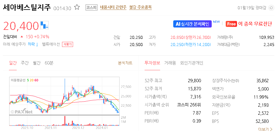 이 글에서는 세아베스틸지주 주가 전망과 목표 주가, 기업 정보에 대해서 설명합니다. 주식 투자의 핵심은 현재의 기업 가치보다는 미래의 가치를 예측하며 먼저 대응하는 것입니다. 투자 대상을 결정하기 위해 먼저 현재 기업 상태와 수치를 검토해야 합니다. 세아베스틸지주 주식의 주요 현황과 투자 정보를 확인하시고 주식 투자에 도움이 될 만한 정보들을 모아 놓았으니 투자를 고려하실 때 참고하세요.