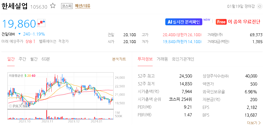 외국인 보유 비중은 6.99% 이며 장중 거래량은 69,424원 을 기록했습니다. 매출액은 13,531억 원을 달성했습니다. EPS는 2,788원이며 한세실업 주식 배당수익률은 1.07% 입니다.