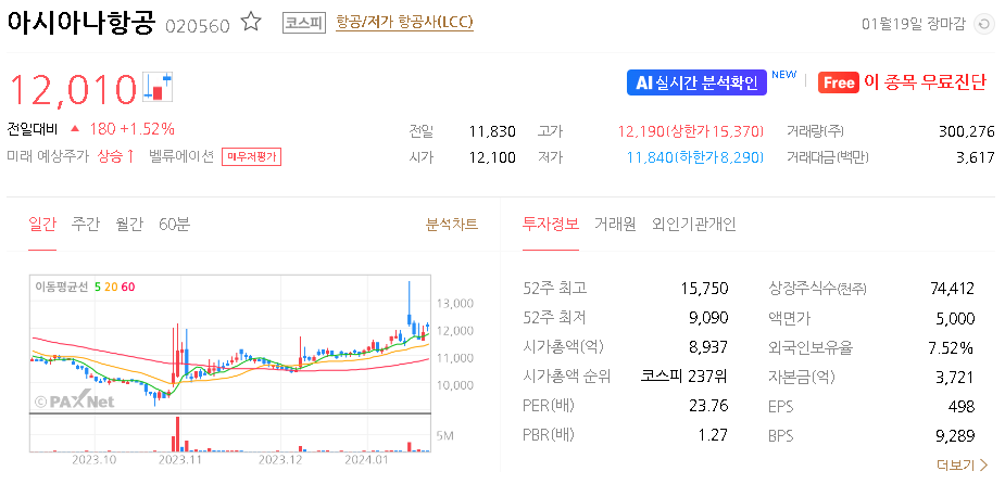 외국인 보유 비중은 7.50% 이며 장중 거래량은 300,641원 을 기록했습니다. 매출액은 55,749억 원을 달성했습니다. EPS는 없음원이며 아시아나항공 주식 배당수익률은 % 입니다.