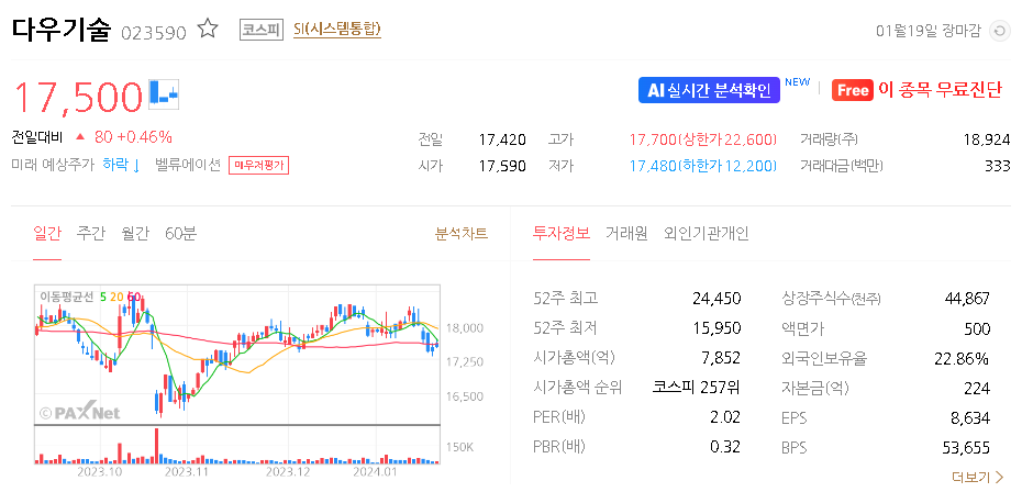 외국인 보유 비중은 22.85% 이며 장중 거래량은 18,928원 을 기록했습니다. 매출액은 76,234억 원을 달성했습니다. EPS는 없음원이며 다우기술 주식 배당수익률은 3.13% 입니다.