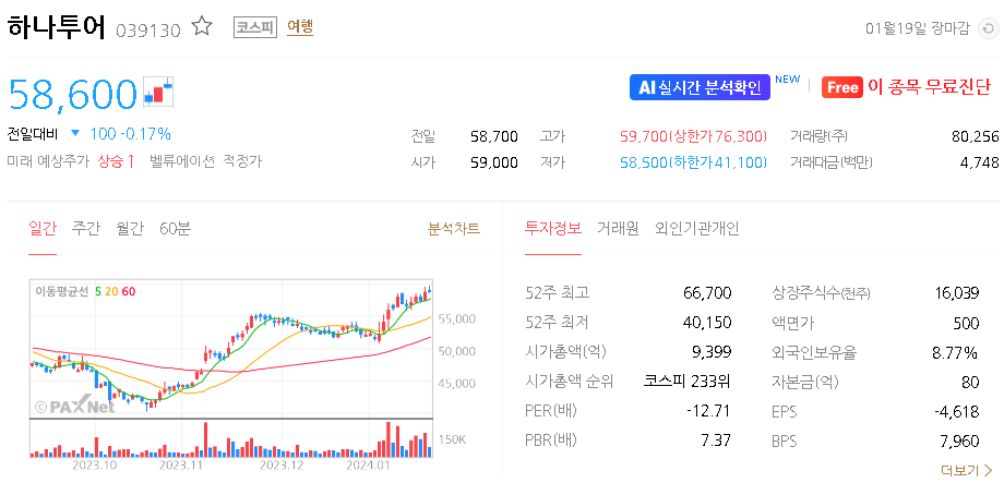 외국인 보유 비중은 8.67% 이며 장중 거래량은 80,924원 을 기록했습니다. 매출액은 2,921억 원을 달성했습니다. EPS는 2,750원이며 하나투어 주식 배당수익률은 % 입니다.