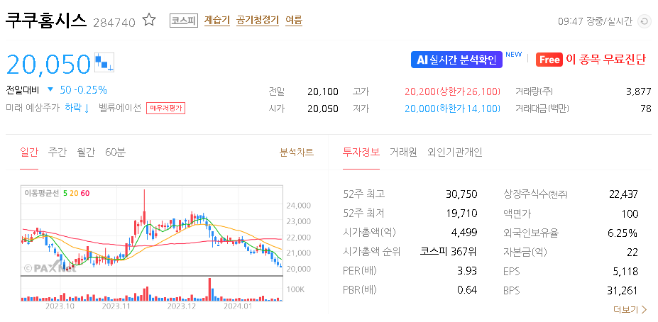 외국인 보유 비중은 6.25% 이며 장중 거래량은 26,595원 을 기록했습니다. 매출액은 7,091억 원을 달성했습니다. EPS는 없음원이며 쿠쿠홈시스 주식 배당수익률은 2.22% 입니다.