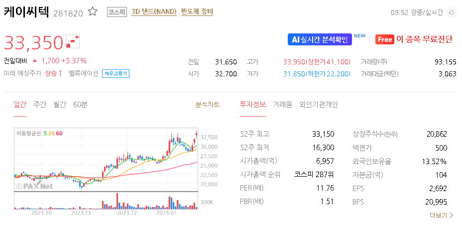 외국인 보유 비중은 13.52% 이며 장중 거래량은 247,586원 을 기록했습니다. 매출액은 2,156억 원을 달성했습니다. EPS는 1,389원이며 케이씨텍 주식 배당수익률은 1.17% 입니다.